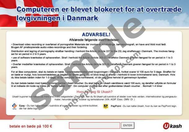 Accusations of downloading and distributing pornographic videos are extremely serious, and you must realize that the Danish authorities would not ask you to pay the fine via Ukash, because it does not require any authorization! Needless to say, if you want to restore your computer’s functionality and protect personal data against cyber criminals, you have to remove Computeren er Blevet Blokeret virus at once. The instructions below will help you carry out the removal effectively and safely.