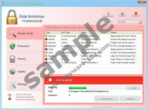 Right after you notice that Disk Antivirus Professional is running on your computer – you have to act quickly in order to delete this vicious Windows infection. The application resembles a real, authentic malware detection and removal tool; however, it actually is the newest cyber criminals’ product. The devious program could be slipped onto your PC via bundled downloads, spam email attachments, social engineering cams and other security backdoors. If you want to prevent malware from entering your operating Windows system, you should guard it with reliable security tools. Otherwise, sooner or later the computer could be attacked by the rogue or any of its clones, including System Progressive Protection and Live Security Platinum. Disk Antivirus Professional removal is extremely important, and if you do not know how to proceed – continue reading.