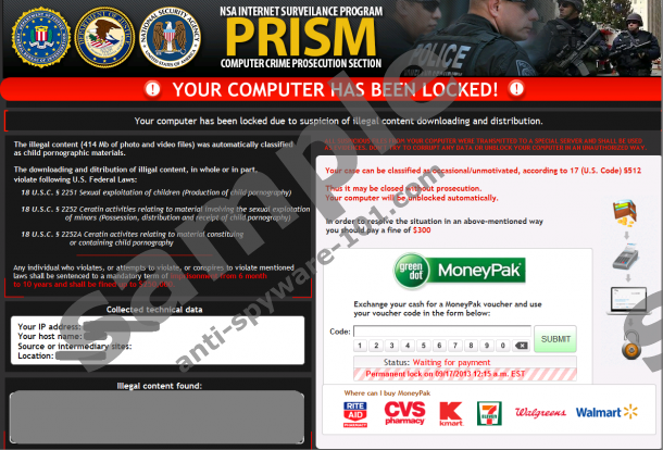NSA Virus “allows” you to avoid criminal sentence by transferring a fine via MoneyPak alternative payment system. However, paying the fine does not guarantee that your computer will be unlocked. In fact, the infection has no intention of leaving your system, because the main reason why it is there is money, and it will continue terrorizing you in order to extract as much money as possible.