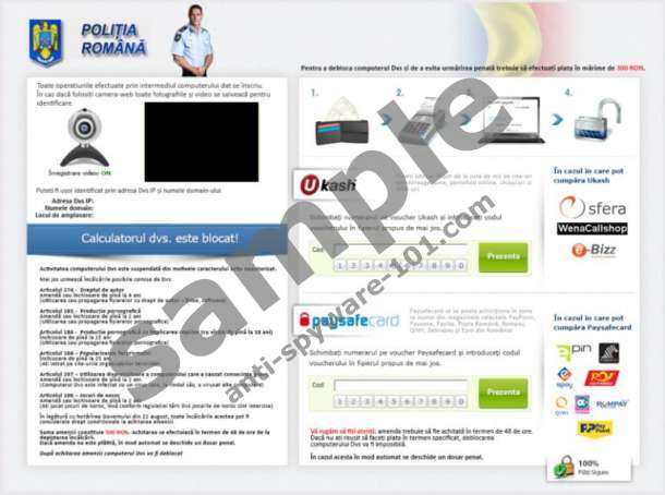 The full-time protection of your computer’s system is vital in this case, because this infection is one of a group of Ukash viruses, whose messages are written in different languages. So far, many different versions of the Ukash virus have been detected, some of which are Eenheid Voor de Bestrijding Cybercrime Virus and Canadian Security Intelligence Service Virus. If you remove this particular variant Politia Romana Virus, it does not mean that you are secure against future infections, unless you use a powerful anti-spyware program.
