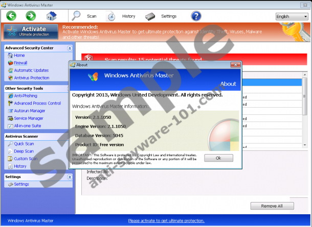 Once the rogue program gets onto your PC, it displays its interface and reboots the computer. After the reboot, Windows Antivirus Master launches its fake scanner which supposedly detects a lot of malicious computer infections. According to the vicious program, you have to activate it in order to have a chance to remove all the threats detected by the scanner. The price of the license depends on the expiration date and varies from $49.95 to $99.9. Nevertheless, by spending your money on the counterfeit program you will not change anything because Windows Antivirus Master is the major infection which you should remove from the computer as soon as you can.