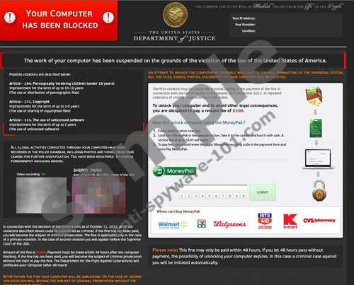 Green dot MoneyPak is a legitimate and seemingly beneficial system that allows you to transfer money rapidly and safely. Regardless, this is just one impression, and www.Anti-Spyware-101.com team recommends staying precautious with MoneyPak. This is due to the fact that schemers may utilize this system to collect fictitious fines. Getting your money is the main purpose of United States Department of Justice Virus, which is why cyber crooks will do whatever it takes to make you give up your savings with free will. How is this done? The main helper in this situation is the fictitious notification which you will not be able to remove from your computer’s screen. Moreover, an irritating computer lock-down will crush all your hopes to delete United States Department of Justice Virus. Here is what will be presented in the fake alert: