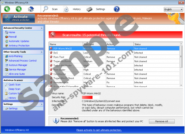 Information, as well as malware, travels through the Internet very fast, and we hope that it is not too late to warn you about Windows Efficiency Kit, a fictitious tool, allegedly detecting tens of different viruses and infections inside your Windows. There is no doubt that your personal computer is infected, and it is hard to tell, whether there are no active Trojans or viruses inside; however, you should not trust bogus application’s computer scanner statements, and should rush to delete Windows Efficiency Kit instead!