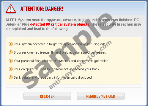 ALERT! System scan for spyware, adware, trojans and viruses was finished. PC Defender Plus detected 99 critical system objects. These security breaches may be exploited and lead to the following: