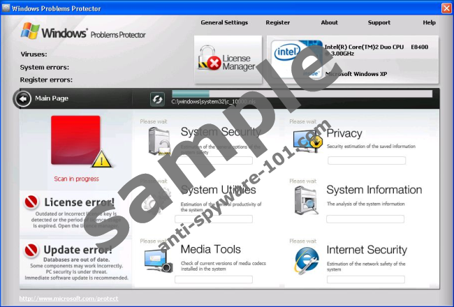 Windows Problems Protector will usually block access to Your desktop. It starts of by showing various warning messages regarding computer security. Windows Problems Protector will also imitate a system scan, reporting with many errors. These tricks are made to scare computer users, and make them believe that Windows Problems Protector is the only way to fix the problems, where the real problem is Windows Problems Protector itself.