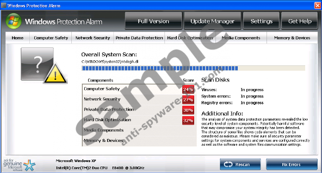 Once Windows Protection Alarm roots in your system, it starts sending various fake security notifications about non-existent viruses and errors which one must delete with Windows Protection Alarm. However, if the user tries to do it, he is confronted with the purchase page for Windows Protection Alarm. This program is obviously a scam and one must remove Windows Protection Alarm from his computer before it managed to cause any distinctive damage and steal all of your money.