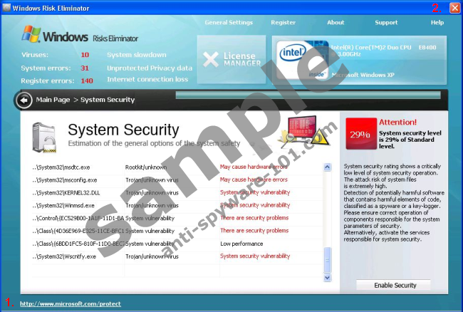 When the Windows Risks Eliminator program appears, click the link at the bottom of the screen (1) and a new window will pop-up. Close this new window and now you should be able to close the Windows Risks Eliminator program (2).