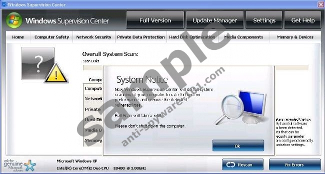 Because of its stealth infiltration of the system, the user will find it difficult to detect and remove Windows Supervision Center from the system without some help. Windows Supervision Center uses bogus online malware scanners, and seditious browser hijacking web domains to root itself in vulnerable PCs. Windows Supervision Center has also been known to bundle its Trojans and malware together with other legitimate security updates and downloads obtained from third party websites.