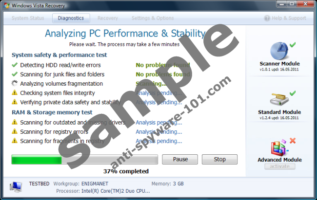 Windows Vista Recovery will enter the system without the user’s knowledge. It will achieve this by making use of various nefarious tactics which will enable it to exploit known system and browser vulnerabilities. These include using bogus online malware scanners, bundling its malware and Trojans together with other legitimate security update and downloads obtained from third party websites and using seditious browser hijackers.